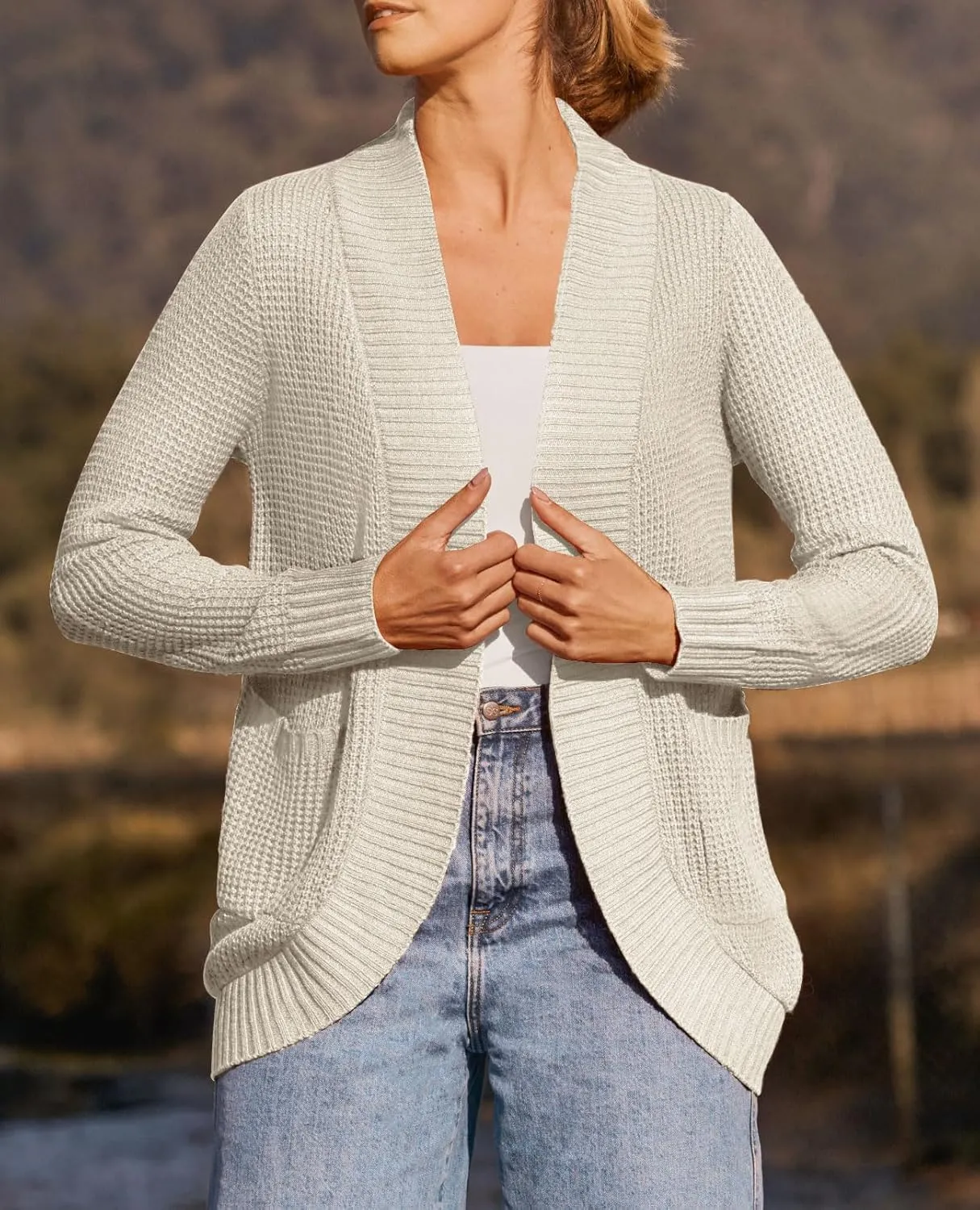 • Features: Solid Color, Open Front, Loose fitting, Long Sleeve, Front ribbed trim at closure, cocoon cardigan